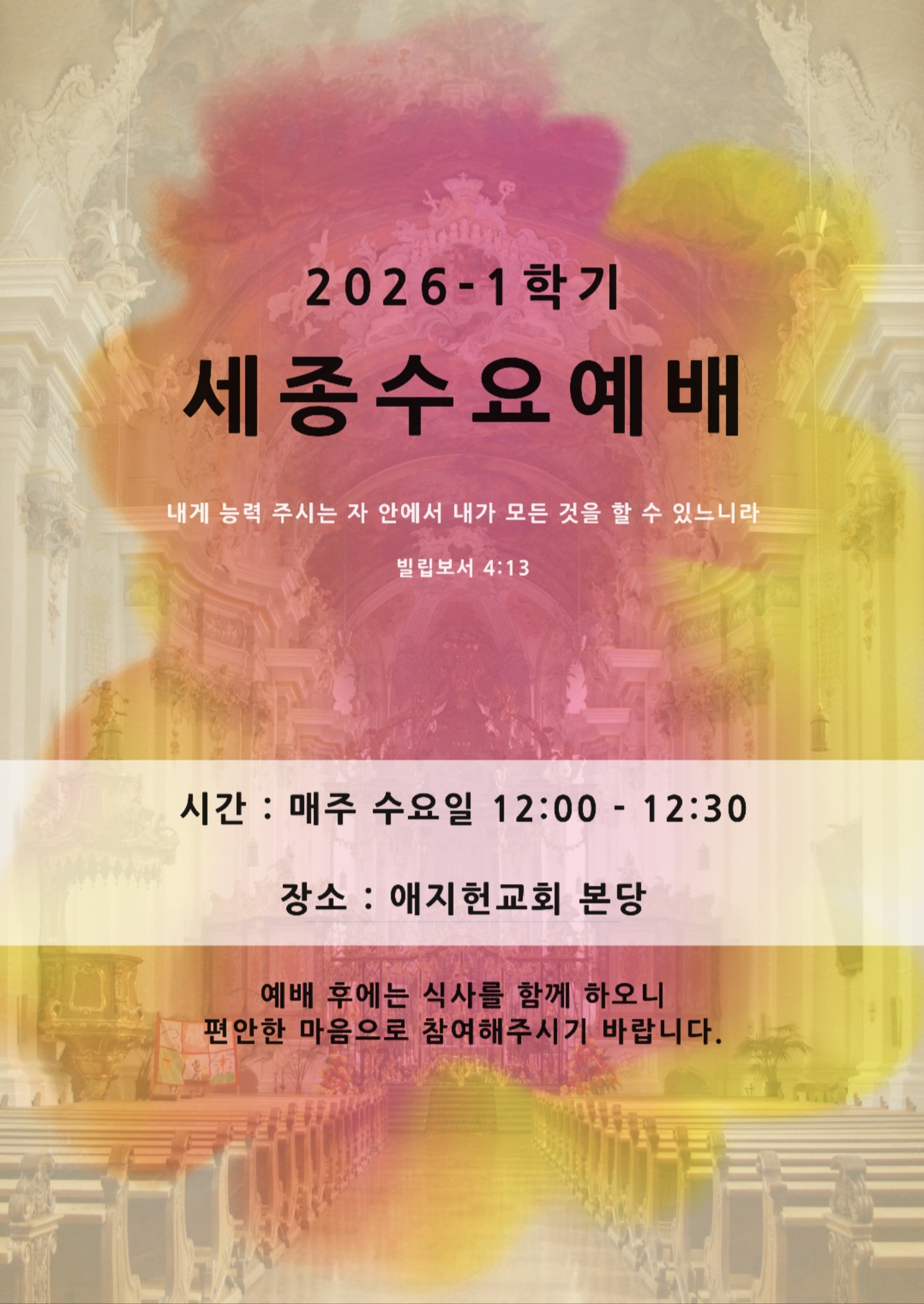 2026-1학기 세종수요예배가 3/4(수) 12시에 애지헌교회에서 시작됩니다.